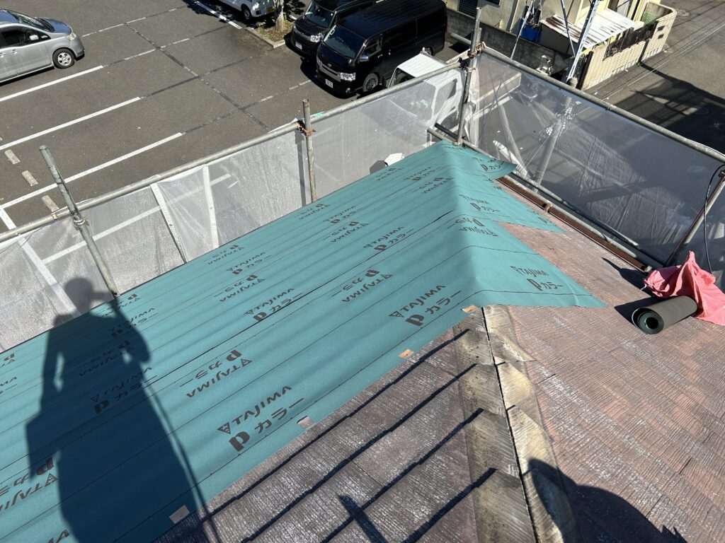 撤去が終わり次に既存屋根材の上に防水紙(アスファルトルーフィング)工事を行います!!!